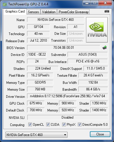 Côté fréquences, elles sont également en régression par rapport à la déclinaison la plus rapide du GF100, mais de peu avec 675 MHz pour le GPU (-3.7 %), (notez le bug dans la détection du nombre d'unités de calcul par GPU-Z) et 900 MHz pour la GDDR5 (-2,6 %) :