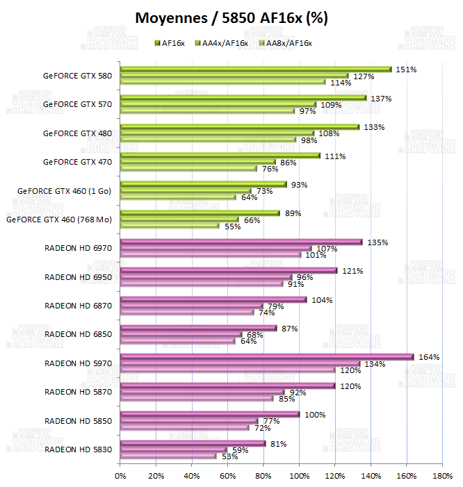 Même si le résultat de chaque test est plus important et judicieux qu'une moyenne globale, cette dernière permet toutefois en un coup d'oeil d'établir une hiérarchie. Voyons donc comment se comportent les nouvelles égéries d'AMD, nous avons pour cela réalisé des moyennes pondérées de chaque jeu et exprimé les résultats en % par rapport au niveau de performance atteint par la HD 5850 en AF16x, ceci sous tous les jeux puis exclusivement ceux utilisant DX11.