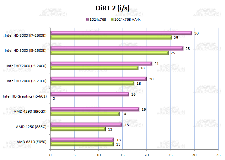 Les HD 3000 mènent la danse, suivis par leur petit frère HD 2000 talonné par l'HD Graphics du Core i5-661. Les 890GX/885G sont totalement dépassés et le HD 6310 les devance aisément.... Malgré une résolution faible, difficile d'imaginer jouer avec AA quel que soit l'IGP ! On poursuit avec Dirt2, en DX9 et les détails sur medium.