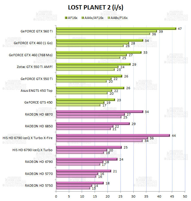 Favorable aux cartes du caméléon du fait d'une utilisation intensive de la géométrie et en particulier de la tesselation dans ce bench, la GTX 550 Ti prend donc l'ascendant sur la HD 6790 sans que cette dernière ne soit complètement larguée pour autant. Encore un excellent scaling en X-Fire !