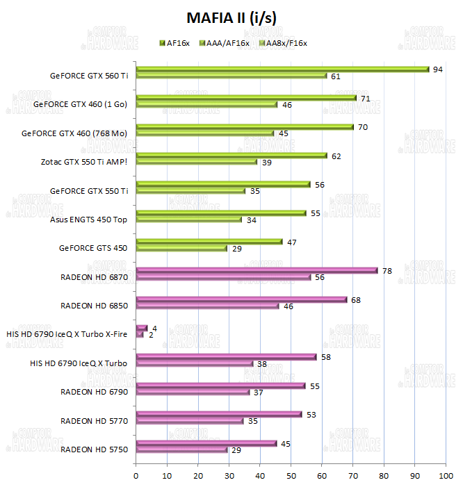 Voilà un jeu attendu qui sort enfin. Concurrent à l'instar de Just Cause 2 du maître en la matière à savoir GTA, Mafia II utilise un rendu DX9 bien sympathique et supporte un anti-aliasing natif (pas toujours visuellement très efficace cela dit) ce qui n'est pas le cas de son concurrent. Nous utilisons le bench intégré au jeu pour évaluer nos protagonistes tout en désactivant les effets PhysX pour ne pas pénaliser les Radeon.