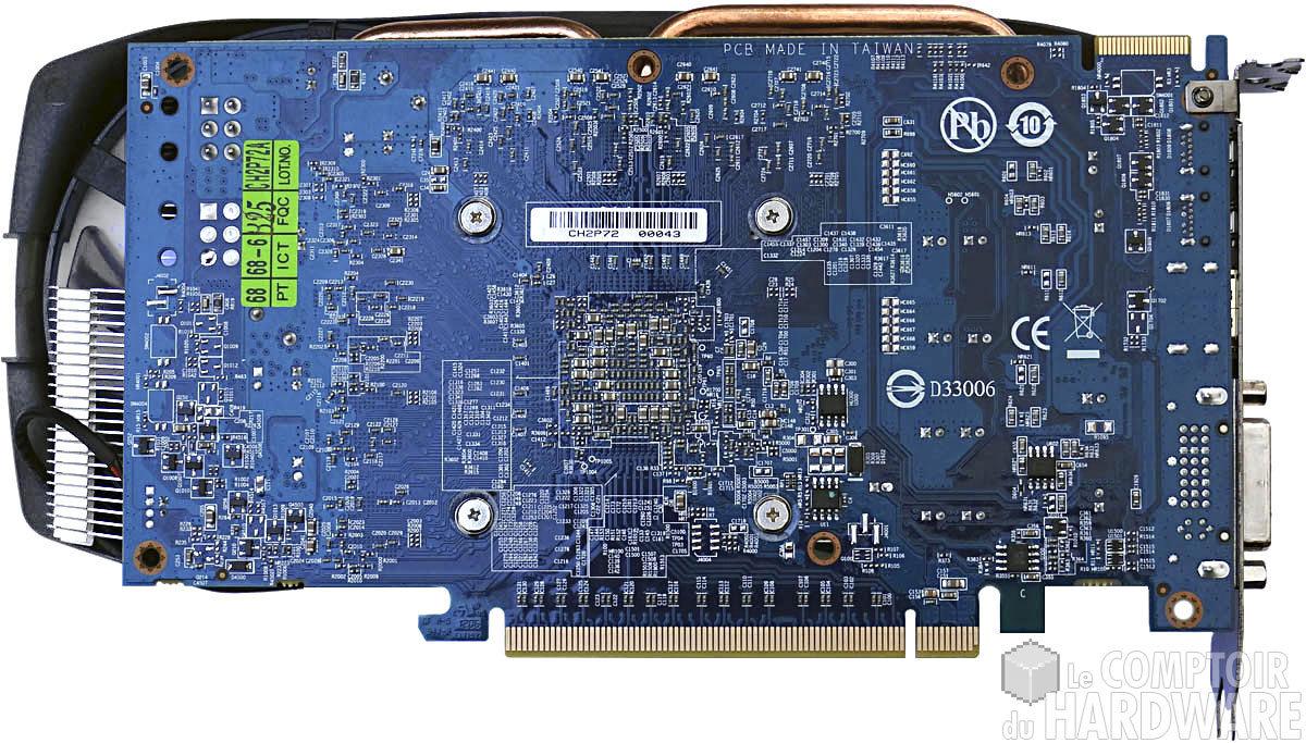 Puisque l'on parle de ce dernier, hormis les 2 ventilateurs axiaux de 10cm, il est constitué de 2 caloducs Direct Touch encastrés dans une base en aluminium surplombée d'un radiateur à base d'ailettes du même matériau, où aboutissent les 2 Heat-Pipes permettant de répartir au mieux les calories à dissiper. Il est toutefois décevant de constater que l'alimentation des ventilateurs est assurée par un connecteur à 2 pins, trop souvent gage d'une thermorégulation peu aboutie... La carte dénudée laisse apparaitre le GPU au centre entouré de 8 puces GDDR5 de 256 Mo. L'étage d'alimentation principal est déporté côté panel plutôt que traditionnellement en bout de carte afin d'optimiser l'encombrement.