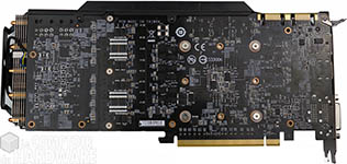 La partie radiateur du refroidisseur est constituée d'une base en aluminium avec au centre un insert en cuivre surplombé par 6 caloducs encastrés. Ces derniers répartissent la chaleur dégagée par le GPU au sein des nombreuses ailettes en aluminium, le flux d'air généré par les 3 ventilateurs axiaux refroidissant le tout ! Notons que les puces mémoires et certains composants de puissance sont en contact avec le dissipateur par le biais de pads thermiques. La carte une fois dénudée laisse apparaitre le GPU entouré des 8 puces mémoires (bus 256-bit oblige) et l'étage d'alimentation spécifique au GPU en bout de carte.