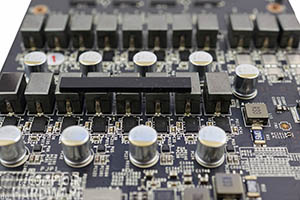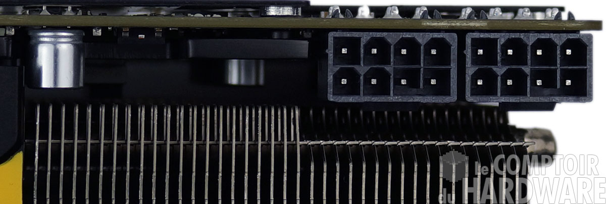 Ce dernier dispose d'une large surface de contact avec le GPU composé de cuivre nickelé d'où s'extraient pas moins de 7 caloducs de 8mm de diamètre chargés de répartir la chaleur au sein du radiateur et de ses ailettes en aluminium, le flux d'air généré par les trois ventilateurs faisant le reste. La carte une fois dénudée laisse apparaitre le GPU entouré des 12 puces mémoires (bus 384-bit oblige) et l'étage d'alimentation très complexe situé en bout de carte. Notons qu'en sus des 3 connecteurs PWM pour les ventilateurs, 3 connecteurs permettent la lecture au multimètre des principales tensions d'alimentation.