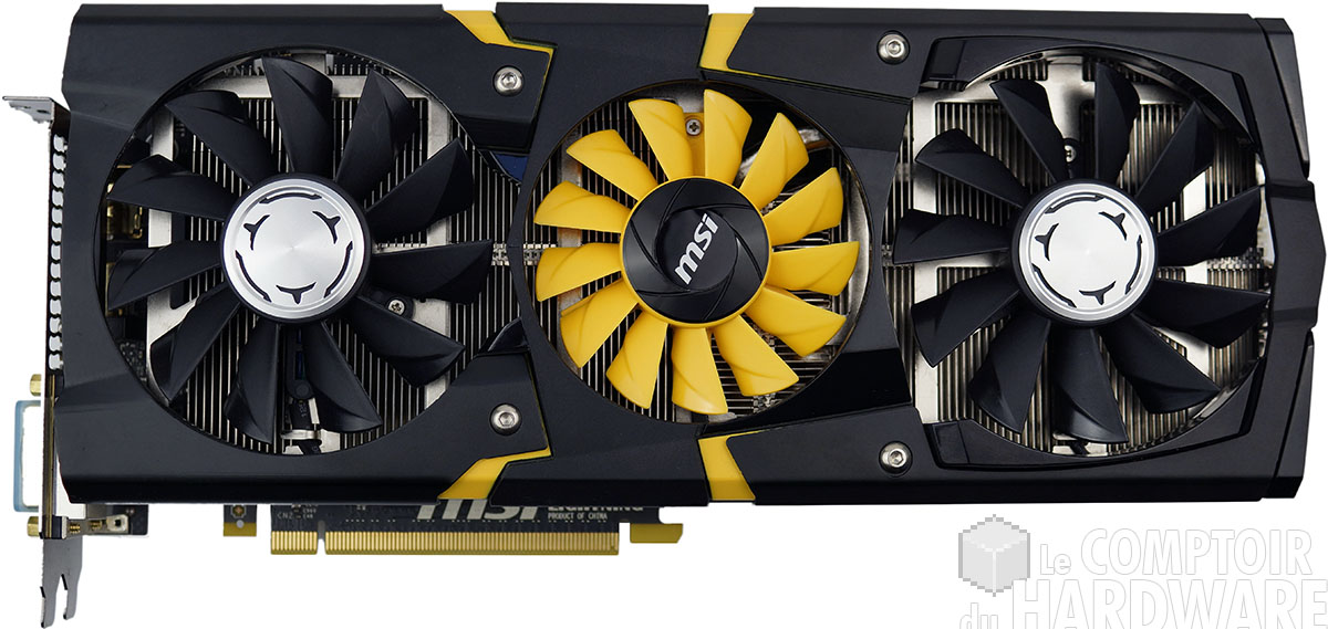 Après les GTX 660 Ti et 770 du constructeur, notre comparatif s'accroit d'une nouvelle référence via une GTX 780 et pas n'importe laquelle puisqu'il s'agit du modèle Lightning, soit le plus performant de la gamme MSI. La palette de couleurs de cette gamme est respectée puisque de petites touches de jaune se mêlent au noir (rouge et noir pour la série Gaming). Exit cette fois le refroidisseur maison TwinFrozr, place au TriFrozr ! Son nom ne laisse planer aucun doute quant à l'évolution : on passe de 2 ventilateurs axiaux à 3. Celui central de couleur jaune utilise 13 pâles pour un diamètre de 8 cm, les 2 ventilateurs extérieurs voyant le leur croître à 9 cm pour 11 pâles. La carte est relativement longue puisqu'elle atteint 29,5 cm, mais elle est surtout très lourde avec un peu moins de 1,5 Kg sur la balance !! Il sera donc indispensable de penser à retirer la carte avant de déplacer la tour sous peine de la retrouver au fond du boitier avec le port PCIe qui avait le malheur de la soutenir... Comme toute GTX 780 qui se respecte, on retrouve bien sur 2 connecteurs SLi et le dos du GPU est recouvert par un capot protégeant le GPU Reactor que nous détaillerons plus bas.