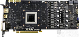 L'étage d'alimentation possède pas moins de 16 phases pour le GPU et 3 pour la mémoire ! Nul doute qu'ils pourront se goinfrer d'électrons sans souci. Côté mémoire, MSI n'utilise pas les classiques R0C d'Hynix pas plus que leurs pendants made in Samsung puisque c'est finalement Elpida qui a été retenu. Un choix original donc, nous verrons lors de la séance d'overclocking s'il s'avère payant...