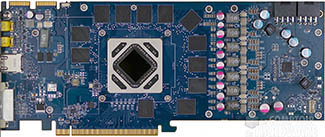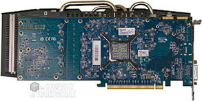 Côté panel, un copier-coller de celui des HD 7K de référence avec un connecteur DVI Dual Link, un HDMI 1.4a high speed et deux mini Display Port 1.2. L'évacuation de l'air chaud est réalisée via les découpes Ad Hoc présentes sur l'équerre supérieure. Côté alimentation, HIS a prévu du lourd avec 2 connecteurs à 8 pins alors que les HD 7970 de référence (GHz y compris) se contentent d'une configuration à 6+8. Vu la longueur de la carte, ces connecteurs sont logiquement orientés à 90° à l'extrémité arrière du PCB.