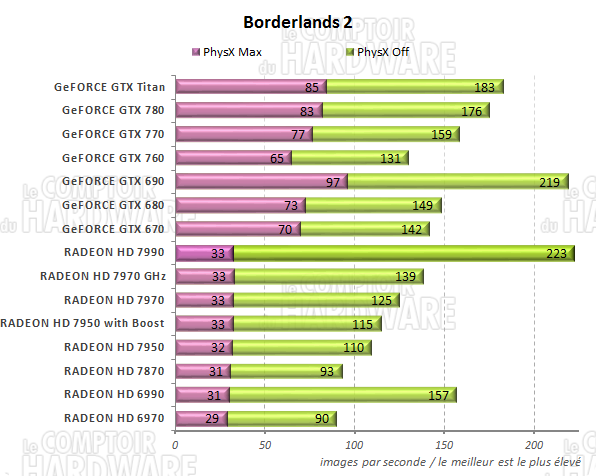 Nous utilisons Borderlands 2 pour évaluer les capacités de gestion de la physique via PhysX. Pour ce faire, nous mesurons les performances du test intégré en 1920x1080 + FXAA sans PhysX tout d'abord, puis avec ensuite :