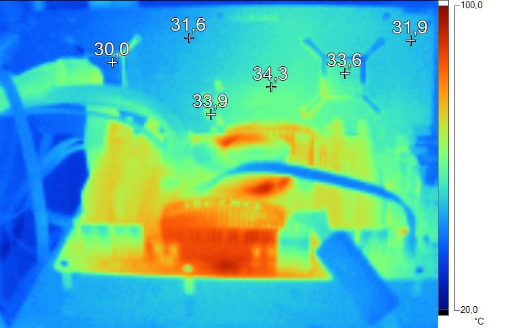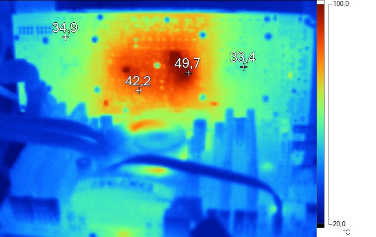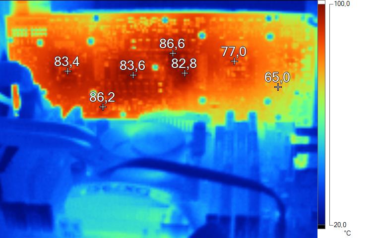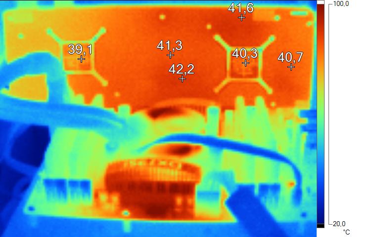 Nous utilisons pour cela les sondes internes monitorées via GPU-Z en tâche de fond durant 20min de charge GPU sévère. Nous laissons ensuite au repos la carte 20mn avant de mesurer à nouveau la température. Les cartes sont installées dans notre boîtier Cooler Master Cosmos II spacieux et disposant d'une ventilation efficace. Nous mesurons la température du GPU le plus chaud s'il y en a plusieurs.