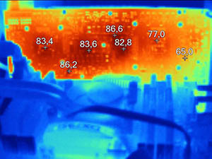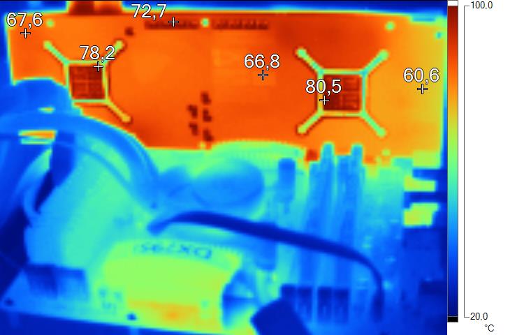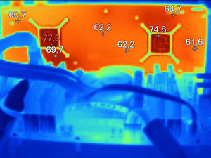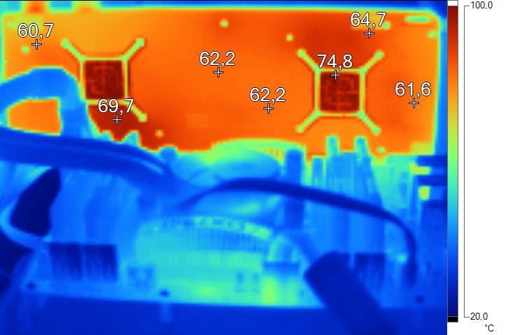 Afin de préciser l'efficacité thermique du refroidisseur de la HD 7990 de référence, rien de mieux qu'une petite séance d'imagerie thermique et la comparaison avec les autres bi-GPU du panel : la carte s'échauffent logiquement en charge, mais on reste à des valeurs tout à fait correctes pour le GPU, le reste de la carte étant protégé par la backplate, on ne mesure pas précisément la température du PCB en particulier au dos de l'étage d'alimentation. Un point commun à toutes les trois toutefois, difficile de les saisir à pleine main et ce même plusieurs minutes après une session de jeu !