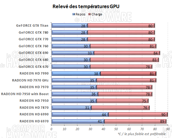 Au repos, toutes les cartes sont parfaitement refroidies même si les modèles bi-GPU d'AMD se montrent plus chauds que la concurrence. En charge, la HD 7990 marque un très gros progrès face à sa devancière et se trouve mieux refroidie que la GTX 690.