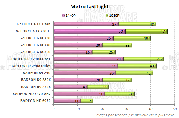 Reprenant l'ambiance malsaine et crasseuse de son prédécesseur, Metro Last Light utilise une évolution du moteur 4A Engine disposant d'une gestion des effets de lumière très avancée, permettant de rendre à merveille les longs tunnels composant le métro moscovite ainsi que les escapades dans les paysages extérieurs témoins de l'hiver nucléaire. Jeu TWIMTBP faisant partie du bundle des GeFORCE (GTX 660 et supérieur), il prend en charge des effets PhysX avancés (brouillard, débris, etc.) en sus de la tesselation, DOF et autres. Cerise sur le gâteau, en sus d'un antialiasing adaptatif, divers mode SSAA sont également disponibles, mais comme toujours très exigeants ! Le jeu est maintenu à jour via Steam, nous utilisons le bench intégré avec l'option PhysX GPU désactivée pour ne pas pénaliser les cartes AMD, toutes les autres étant réglées sur leurs valeurs maximales et le SSAA activé.