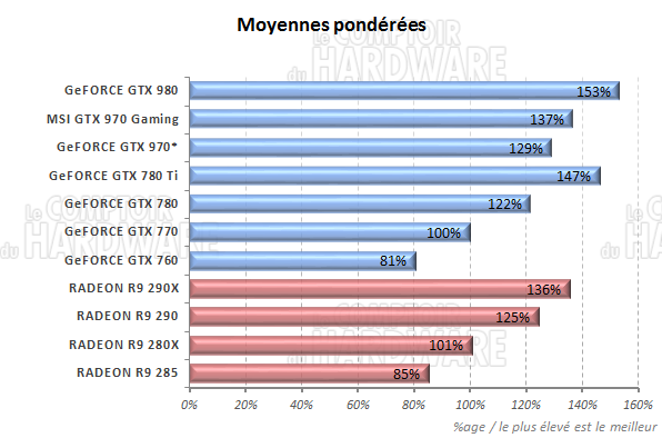 Même si le résultat de chaque test est plus important et judicieux qu'une moyenne globale, qui par essence ne traduit que le comportement moyen des solutions évaluées ici avec ce panel de jeux (et les scènes retenues parmi ces derniers !) masquant ainsi des résultats bien différents selon les situations de test, cette dernière permet toutefois en un coup d'oeil d'établir une hiérarchie. Voyons donc comment se comportent les candidates : nous avons pour cela réalisé des moyennes pondérées de chaque jeu et exprimé les résultats en % par rapport au niveau de performance atteint par la GTX 770.