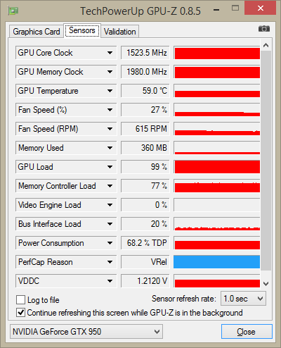 MSI a fait du bon boulot avec sa 950 Gaming puisqu'elle ne décolle pas des 1380 MHz tout au long du test, la température se stabilisant aux alentours de 63°C et le TDP n'étant pas non plus un facteur limitant (95% atteint tout de même d'après GPU-Z).
