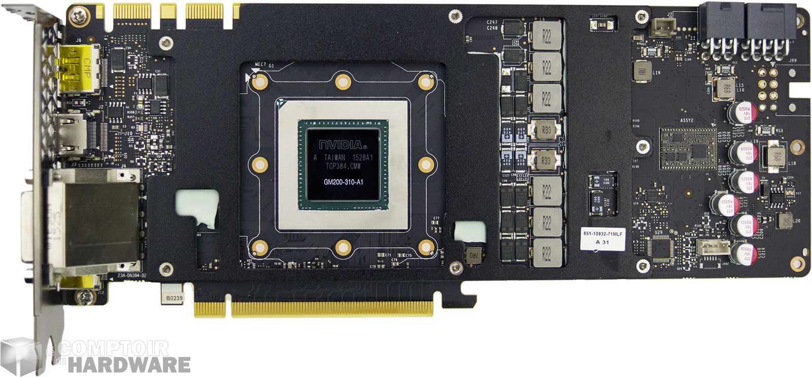 Le GPU est bien sûr un GM200-310, 980 Ti oblige, il est entouré des 12 puces mémoires d'origine Hynix certifiées 7 Gbps et constituant les 6 Go embarqués. L'étage d'alimentation reprend le design concocté par NVIDIA qui dispose de 6 phases pour le GPU auxquelles s'ajoutent 2 VRM additionnels réservés à la mémoire.