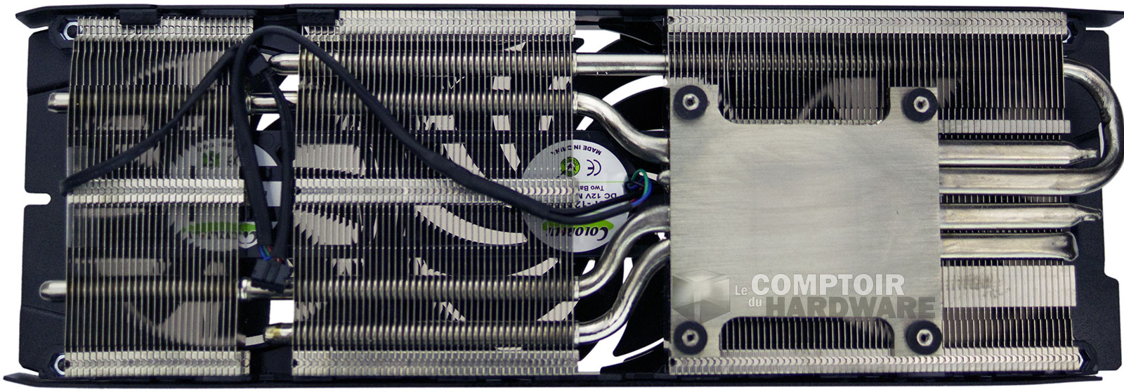 Le refroidisseur est constitué d'une base en aluminium surplombée par 4 caloducs chargés de diffuser la chaleur produite par le GPU au travers des nombreuses ailettes en aluminium. Le souffle en provenance des 3 ventilateurs se charge de dissiper tout cela. La mémoire et les composants sensibles de l'étage d'alimentation disposent de leur propre dissipateur, en fait une banale pièce métallique peinte en noir que la carte dénudée laisse apparaitre, tout comme le PCB noir au design de référence.