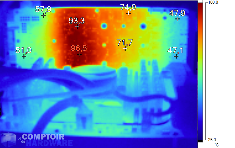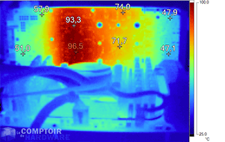 Pour préciser notre avis quant à l'efficacité thermique du refroidisseur de la PNY GTX 980 Ti XLR8 OC, rien de mieux qu'une petite séance d'imagerie infrarouge : au repos, c'est comme toujours l'étage d'alimentation qui obtient le pompon avec 32.5°C, aucune backplate ne nous empêchant (cette fois) de voir l'intégralité du PCB. En charge, il le conserve avec 96,5°C, une valeur qui commence à être élevée même si relativement courante pour ce type de composant sur les cartes haut de gamme. On pointera tout de même du doigt le fait que la 980 Ti de référence, certes non overclockée, propose des températures à ce niveau bien plus correctes (81°C)...