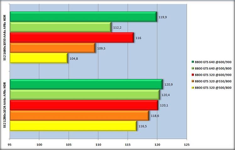 Jusqu'en 1280x1024, toutes les cartes se tiennent, malgrés la lourdeur de la scène choisie. La donne change un peu en 1680 ou la 8800 GTS 320 Mo se fait distancer par le modèle à 640Mo, la BFG étant overclockée d'usine propose des résultats meilleurs que les 8800 GTS de base, grâce notemment à la fréquence des shader qui est à 1300MHz. Toutefois, même en 1680, il est difficile à l'oeil nu de départager les candidates tant le niveau de performances atteint est impressionnant.