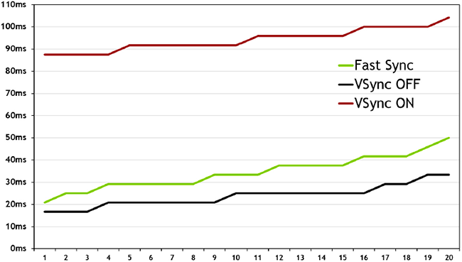 Enfin, NVIDIA met en avant une nouvelle évolution au niveau du rafraichissement des écrans. Après avoir lancé l'Adaptative Sync puis G-Sync voici Fast Sync ! Très schématiquement, il s'agit d'un nouveau compromis : supprimer le déchirement d'image qui apparait inéluctablement dès que l'on désactive la synchronisation verticale tout en évitant l'augmentation sensible de la latence induite par le VSync On. Pour ce faire, NVIDIA a implémenté une variante hardware du triple buffering qui permet ainsi de supprimer le tearing tout en limitant l'impact en termes de latence comme en atteste le graphique suivant. Reste que l'on préfère largement les techniques de rafriachissement variable, même si elles sont plus coûteuses.