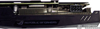 Le panel de connexion est identique à la 1070 Strix avec 2 HDMI, 2 DP et un DVI(-D). L'alimentation électrique additionnelle est assurée par un connecteur à 8 pins auquel ASUS à adjoint un second à 6 pins. Le logo ROG sur la tranche est lui aussi rétroéclairé.