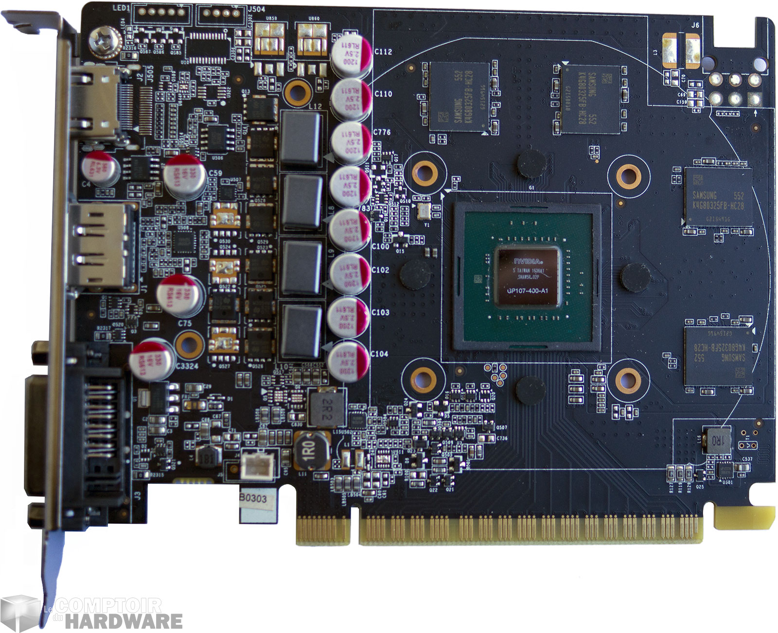 Le GPU est référencé GP107-400-A1, indiquant une puce complète et sans grande difficulté de mise au point. Les puces mémoires de 8 Gigabits sont d'origine Samsung et bel et bien certifiées à 7 Gb/s, contrairement aux RX 460 utilisant des puces 6 Gb/s overclockées. Un petit cadre en plastique protège les extrémités du packaging GPU qui conserve une taille classique pour cette gamme : 29 x 29 mm, NVIDIA n'a donc pas suivi AMD dans la miniaturisation (24,5 x 24,5 mm pour P11). L'étage d'alimentation, composé de 4 phases, est plus développé que ce à quoi on pouvait s'attendre vu l'enveloppe thermique annoncée, cela devrait limiter l'échauffement des transistors de puissance.