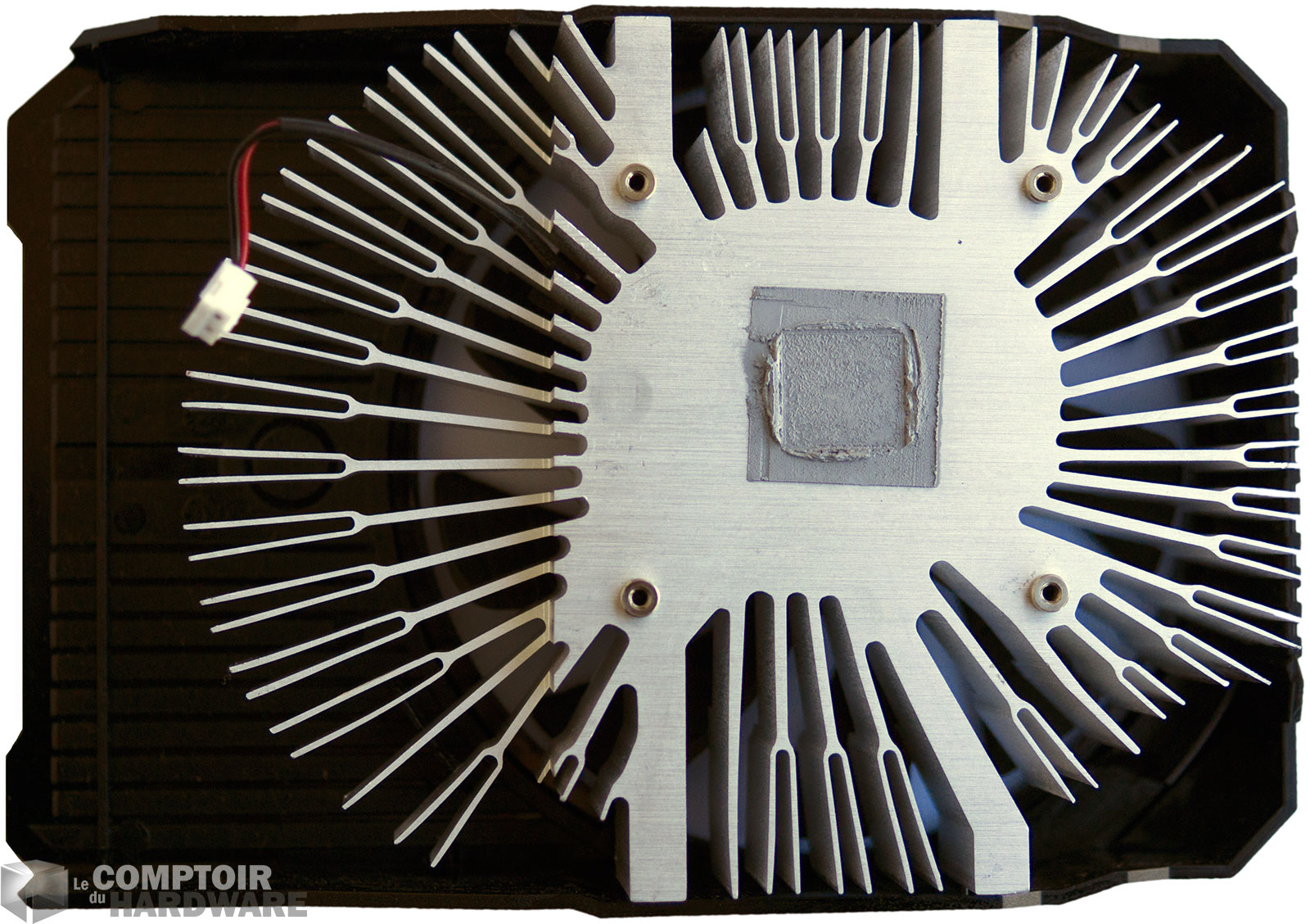 Le radiateur ressemble beaucoup à ceux utilisés par Intel pour ses CPU : un bloc d'aluminium circulaire au centre d'où s'extraient des ailettes en aluminium prolongeant la forme ovoïde. Le ventilateur est alimenté par un connecteur à 2 pins limitant ainsi les possibilités de régulation. C'est donc très simple et s'explique par la consommation annoncée très réduite du GPU. Les puces mémoires et les composants sensibles de l'étage d'alimentation ne disposent pas de dissipateurs dédiés, ils profitent par contre du flux d'air en provenance du ventilateur. Le ventirad retiré, le PCB très court se dévoile. Au centre trône GP107 entouré par 4 puces mémoire. L'étage d'alimentation est comme souvent dans cette gamme, déporté du côté des slots de fixation. Notons tout autour du GPU la présence d'entretoises circulaires le protégeant lors de la mise en place du dissipateur.