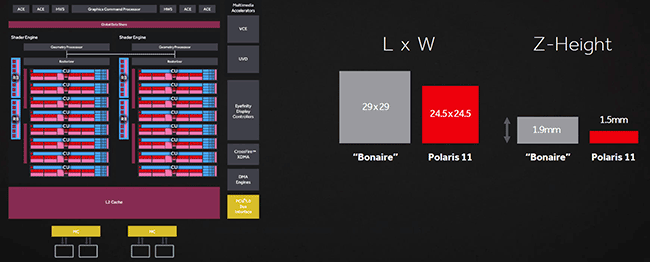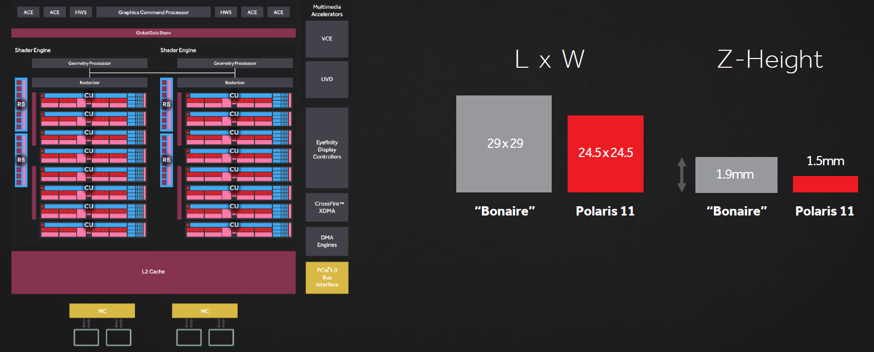 Sa taille réduite permet d'abaisser significativement les coûts de production (plus de GPU par wafer). Pour ce faire, il n'emploie plus que deux Shader Engine (4 pour Ellesmere) impliquant un débit maximum de 2 triangles par cycle. Au sein de ceux-ci, le nombre de CU (Compute Unit, intégrant chacune 64 unités de calcul et 4 TMU pour le texturing) est légèrement réduit par rapport à son grand frère en passant de 9 à 8 pour un total de 16 dans un P11 intégral, soit 1024 unités de calcul et 64 TMU. Du côté interface mémoire et cache, là aussi en comparaison de P10, tout est divisé par deux avec 16 ROP, un cache L2 à 1 Mo et un bus 128-bit.