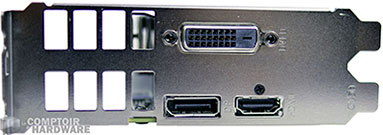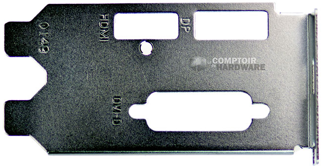 La carte emploie 2 slots pour sa fixation, la partie non utilisée étant largement ajourée. Le panel de connexion est identique aux autres GTX 1050 puisque composé d'un HDMI 2.0b et d'un Display Port (jusqu'à 1.4 Ready) nécessaire pour profiter du HDR en 4K, ainsi que d'un DVI-D Dual Link. Inclus dans la boîte, une équerre demi-format pour utilisation dans les boîtiers adaptés.