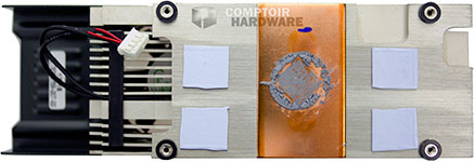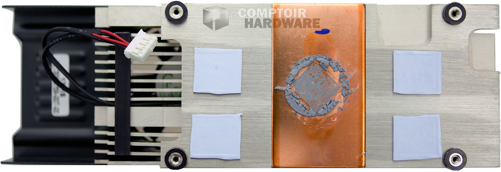 Le radiateur explique l'inflation du poids entre les deux GTX 1050 : on a affaire à un très massif bloc aluminium hérissé d’ailettes avec au centre un large insert en cuivre.