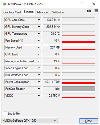 Poursuivons la description de notre carte au travers de GPU-Z : on retrouve donc le GP107 configuré avec 640 unités de calcul, 40 TMU activées. Du côté des fréquences, l'overclocking est plus que limité puisque KFA² n'a appliqué en définitive qu'un bin (13 MHz) de plus que les spécifications du caméléon pour une GTX 1050. Côté mémoire, retour aux valeurs standard, à savoir 4 Go adressés en 128-bit et cadencés à 1,75 GHz.