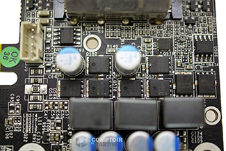 Les puces mémoire profitent également du dissipateur par le biais de 4 pads thermiques assurant la jonction. Les composants sensibles de l'étage d'alimentation disposent d'un petit radiateur dédié et du flux d'air en provenance d'un ventilateur, puisque KFA² a eu la bonne idée d'échancrer le radiateur principal pour cela. Le ventirad retiré, le PCB très fin se dévoile. Au centre trône un GP107 qui a pivoté à 45° afin de faciliter le routage des pistes. Il est entouré par 4 puces mémoire. L'étage d'alimentation est comme souvent dans cette gamme, déporté du côté des slots de fixation.