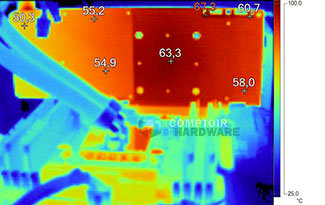 Au repos, la carte est parfaitement refroidie, en toute logique, la backplate empêchant naturellement une lecture précise des points éventuellement plus chauds. En charge la température monte notablement, on relève plus de 67°C à certains endroit du PCB visible. Faute de temps, nous n'avons pas pu aller plus loin dans l'analyse IR de cette carte.