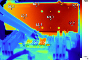 Au repos, la carte est parfaitement refroidie, en toute logique, la backplate empêchant naturellement une lecture précise des points éventuellement plus chauds. En charge la température monte notablement, on relève près de 80°C à certains endroits visibles du PCB. Pour rappel, nous n'avons pas pu démonter cette plaque arrière du fait de la "protection" de vis par des étiquettes, dont une comportant le numéro de série.