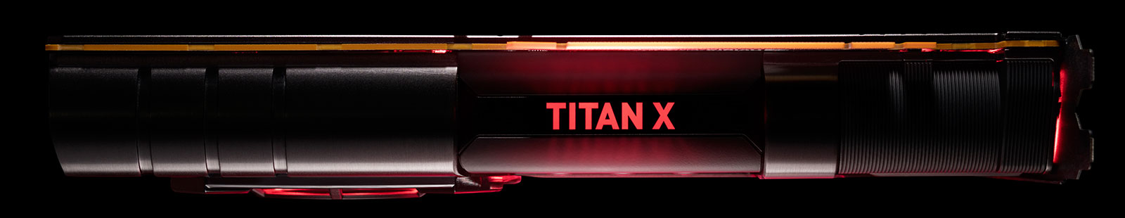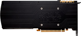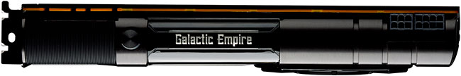 L'alimentation électrique est assurée par un connecteur à 8 broches complété d'un second à 6 pins, tous deux positionnés sur la tranche, solution qui autorise une consommation maximale de 300 W, suffisant pour un TDP annoncé à 250 W (identique à celui de la GTX 1080 Ti). Le logo Galactic Empire est bien entendu rétroéclairé par LED rouge, il en est de même pour le logo TITAN X sur la tranche opposée, ce qui a pour effet de créer 2 halos, représentant la garde (les 2 quillons) laser du sabre de Kylo REN.