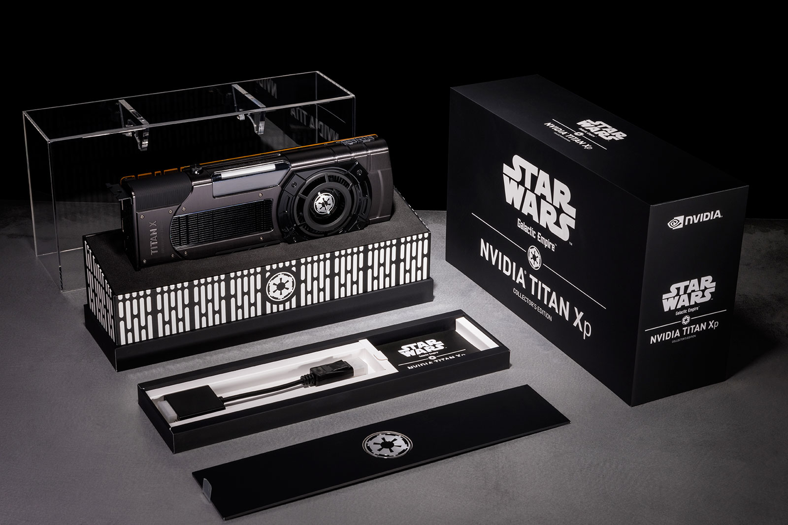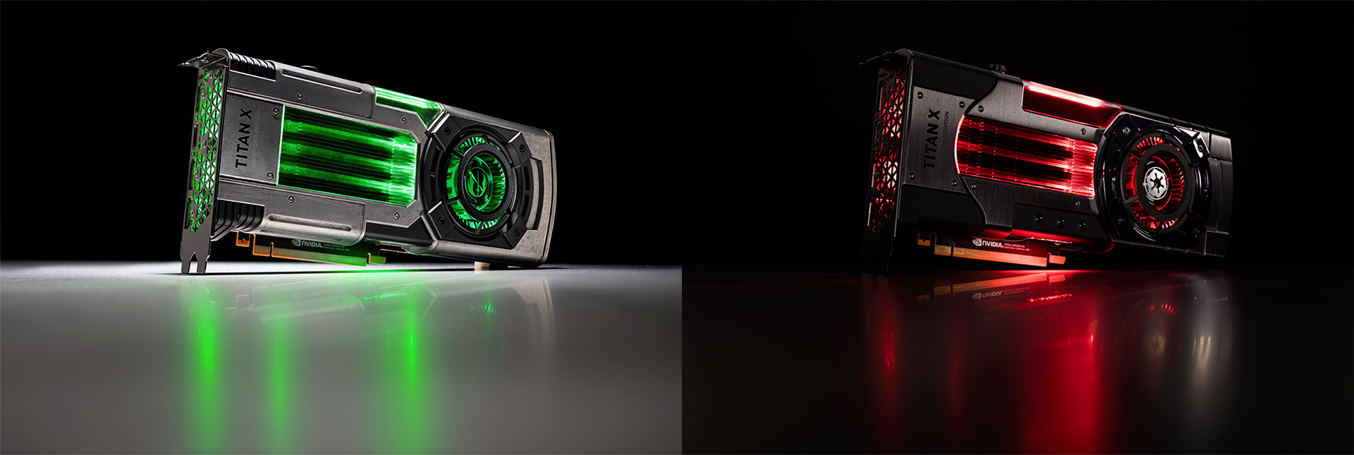 Pour ce test, NVIDIA nous a permis de choisir parmi les 2 modèles de TITAN Xp Collector's Edition disponible : soit Jedi Order, soit Galactic Empire. Plutôt fan du côté obscur, nous avons opté pour la seconde utilisant les codes couleur de ce dernier, à savoir noir et rouge. Le côté lumineux de la force est représenté par le vert et un aluminium "vieilli" du plus bel effet également. Sachez que l'une comme l'autre peuvent être acquises en ligne directement sur le site du caméléon au tarif "promotionnel" de 1138 €, alors qu'il faut compter 1349 € en boutique traditionnelle.