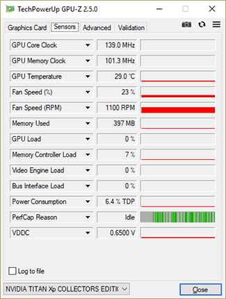 Poursuivons la description de notre carte au travers de GPU-Z, dont la version 2.5.0 détecte parfaitement la TITAN Xp Collector's Edition. Sont donc bel et bien présentes les 3840 unités de calcul, accompagnées de 240 TMU. Les 96 ROP et le bus mémoire 384-bit adressant les 12 Go de mémoire répondent également à l'appel. Pour les fréquences GPU, ce dernier mouline théoriquement à 1582 MHz (identique à la GTX 1080 Ti) en boost, il s'agit toutefois d'une valeur officieuse, tout cela dépendant de nombreux facteurs dont la température, consommation et qualité de la puce. La mémoire est cadencée de son côté à 1426 MHz (11,4 Gbps), conformément aux spécifications du caméléon.