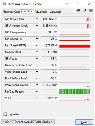 A présent, GPU Boost 3.0 introduit un changement notable par rapport à la précédente version. Il s'agit d'une limitation plus drastique de la température du GPU, qui s'active dès 37°C et réduit par paliers la fréquence (un bin tous les 5°C) afin de retarder la montée en régime de la ventilation et donc les nuisances sonores. Sous forte charge, le GPU atteindra (moins vite) toujours la température de consigne maximale (84°C sur les cartes à base de GP102) sur une FE et perdra à ce moment autant de bins que nécessaire pour la conserver. Toujours est-il que la valeur maximale que nous avons notée est de 1911 MHz, soit 5 bins de plus que la TITAN X (Pascal) que nous avions testée, et un de plus notre GTX 1080 Ti FE.