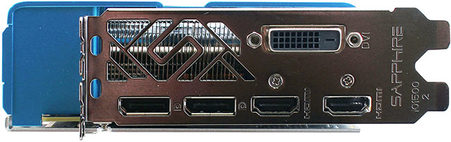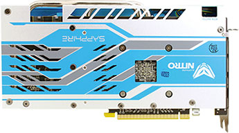 Pour l'alimentation de la belle, Sapphire a prévu un connecteur PCIe à 8 broches flanqué d'un second à 6, de quoi proposer jusqu'à 300 W avec l'apport du PCIe en respectant les préconisations. Une jolie marge par rapport au TDP officiel, qu'il est loin le raté de la RX 480 de référence, avec un seul connecteur à 6 pins conduisant à outrepasser l'intensité tirée du port PCIe en fonctionnement nominal. Deux caloducs, permettant de répartir la chaleur au sein du radiateur, surplombent la tranche de cette carte. Pour être complet, le logo Sapphire est rétroéclairé par des LED multi-couleurs lui aussi, ces dernières étant pilotables via le logiciel maison.