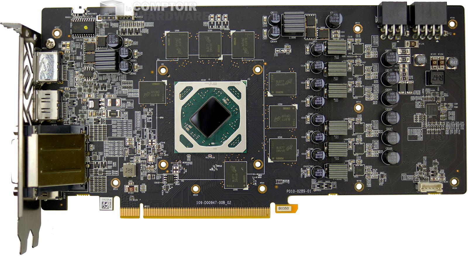 Deux ventilateurs axiaux translucides de 95 mm rétroéclairés par des LED bleues, assurent le flux d'air pour le refroidissement. La carte mesure 26 cm de long pour un kilogramme tout rond. La face arrière est recouverte d'une plaque en aluminium échancrée au dos du GPU et de l'étage d'alimentation. Elle participe d'ailleurs au refroidissement de ce dernier, par le biais d'un insert métallique au niveau des composants de puissance. Enfin, un switch permet de basculer entre les modes gaming ou compute.