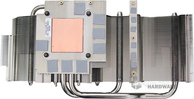 Pour le refroidisseur de sa RX 590 Nitro+ SE, Sapphire réutilise celui de sa 580, composé d'une base en cuivre dédiée au GPU, encastrée au sein d'une masse en aluminium surplombée par des ailettes du même matériau, parcourues par 4 caloducs diffusant la chaleur. Les puces mémoires sont en contacts via des pads thermiques avec la base centrale, l'étage d'alimentation dispose de son côté d'une surface de contact dédiée, la liaison étant réalisée par le même biais.