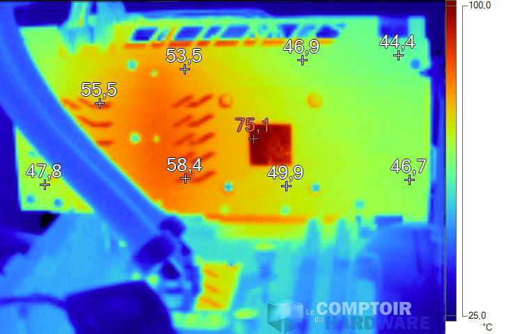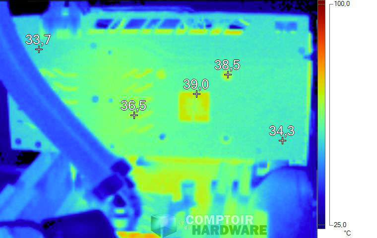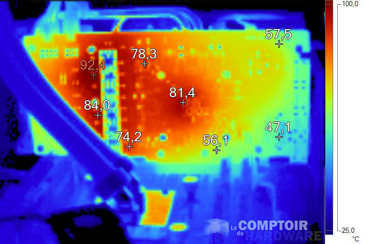 Au repos, aucune température alarmante à signaler, malgré l'absence de ventilation sur la carte. En charge, le retrait de la backplate permet de mesurer le point chaud au dos de l'étage d'alimentation, à plus de 92°C. Si les composants utilisés sont effectivement conçus pour des températures élevées, une telle valeur est plus courante sur le haut de gamme qu'en Mainstream. A noter la présence d'une barrette d'aluminium vissée sur la backplate, permet le contact (via un pad thermique) de cette dernière avec le dos du PCB, au niveau des composants de puissance.