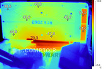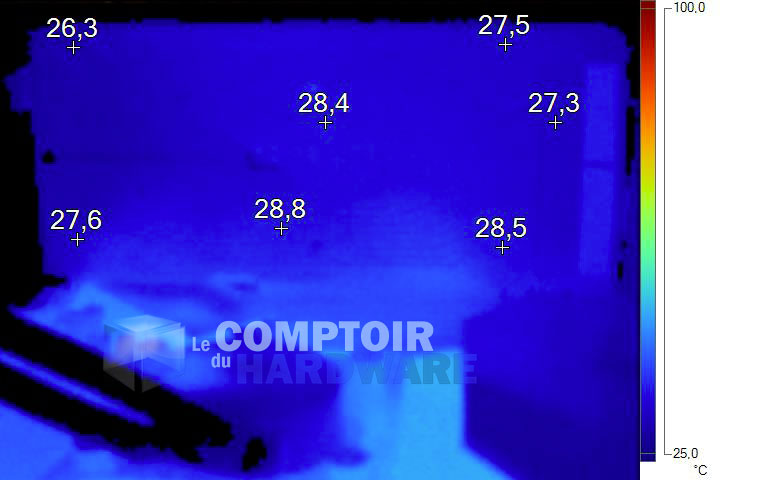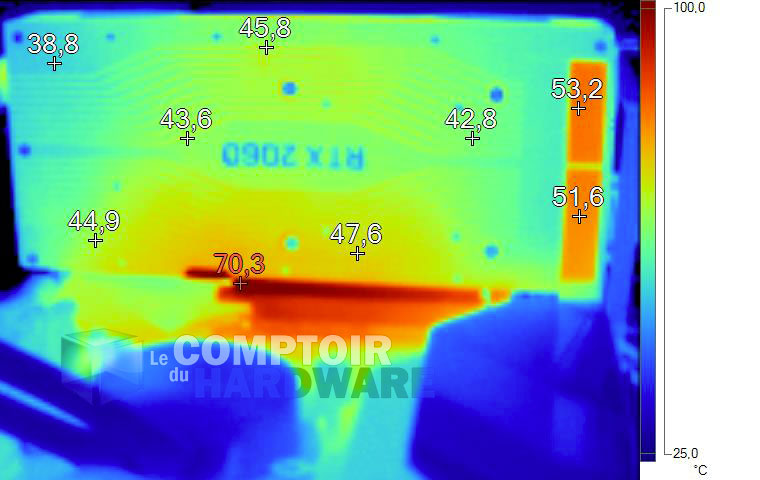 Au repos, aucune température alarmante à signaler. En charge, le retrait de la backplate permet de mesurer le point chaud au niveau de l'étage d'alimentation CPU, à un peu moins de 82°C. Une valeur qui, sans être excessive, loin de là, reste relativement élevée pour une carte proposant ce niveau de consommation. Les 6 phases ne semblent pas sous dimensionnées, c'est donc la très faible ventilation en charge qui semble expliquer ce fait, qui n'a toutefois rien d'alarmant, rappelons-le. Les autres points chauds mesurés se situent essentiellement au dos des puces mémoire.
