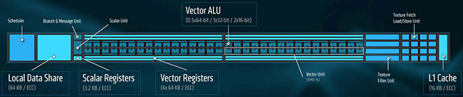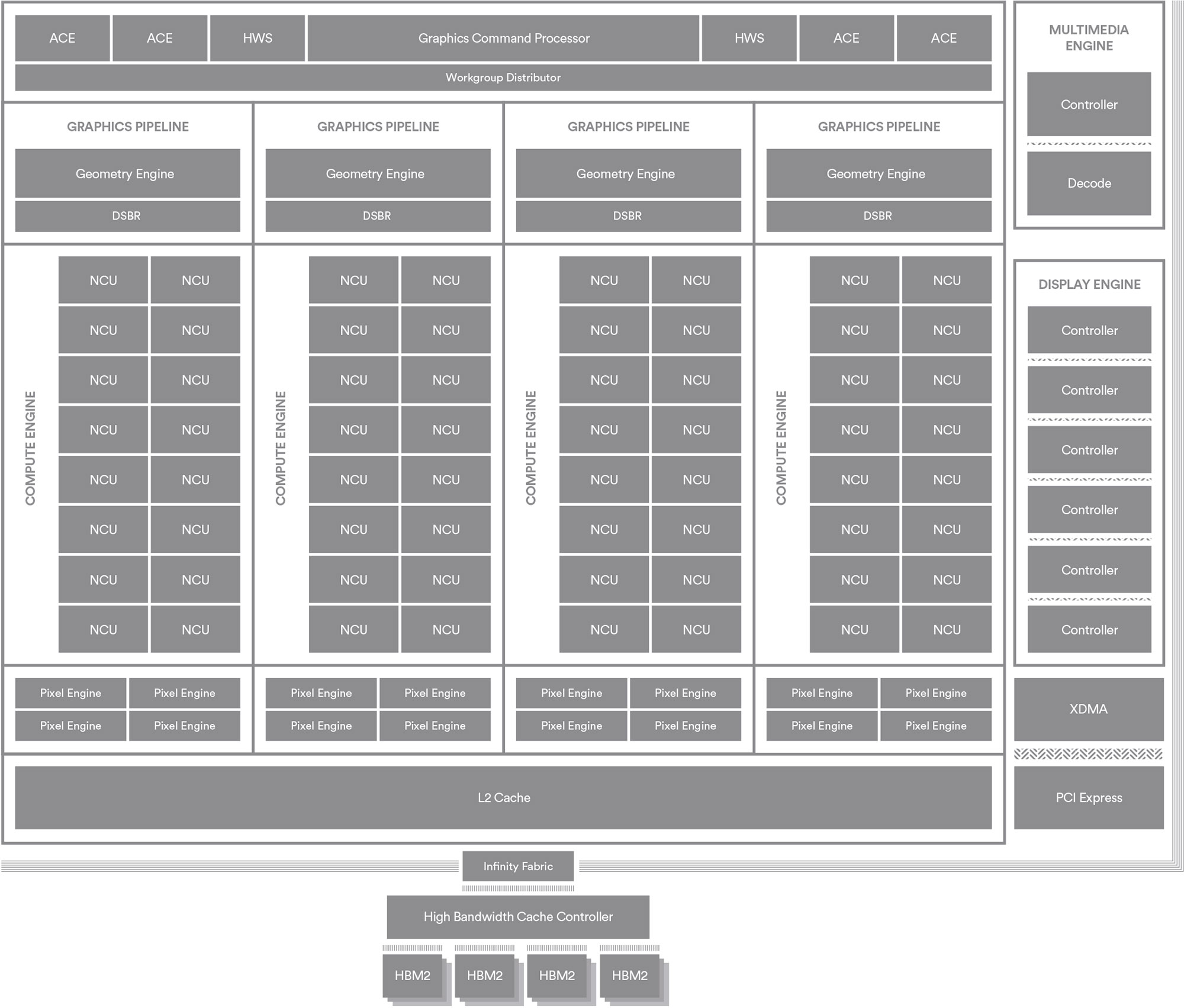 Pour ceux intéressés par l'architecture Vega, nous vous invitons à lire ou relire la page que nous lui avions consacrée lors du dossier dédié à la RX Vega64. Résumée en quelques lignes, cette dernière s'appuie toujours sur GCN (Graphics Core Next) intronisé avec les Radeon HD 7900, même si AMD a fait disparaître toute référence à cette dénomination pour l'architecture. On peut toutefois considérer Vega comme étant la 5ème itération de GCN, avec des évolutions au niveau des unités de calculs supportant à présent la 1/2 précision (FP16) à double vitesse.