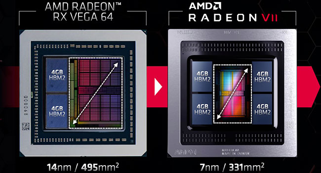 Ce n'est pas anodin, la fabrication d'interposers de grandes tailles nécessite une production par multi-exposition bien plus coûteuse et donc difficile à rentabiliser, surtout dans le cadre d'une carte grand public. Les puces HBM 2 produites en masse étant à minima d'une capacité de 4 Go, Vega 20 ne peut donc embarquer moins de 16 Go, tout du moins pour converser la bande passante mémoire de 1 To/s permise par une telle configuration à 4 piles.