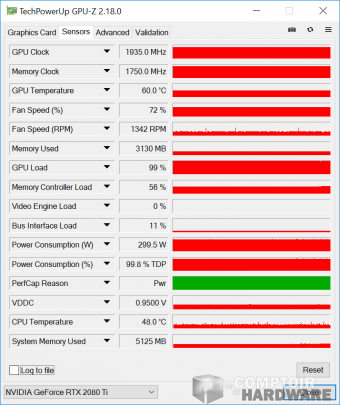 A première vue la carte grimpe vite au compteur pour une 2080 Ti en taquinant les 2 GHz tout enrestant à 60°C au niveau du GPU. Une belle performance, mais qui s'obtient avec des moulins à 70%, nous verrons quelle incidence cela a sur notre configuration plus tard.