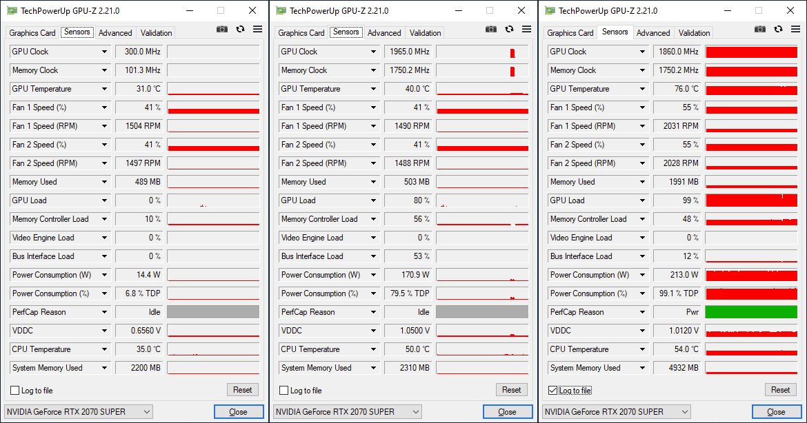 Que pense GPU-Z de ces SUPER ? Dans sa version 2.22, il les reconnait parfaitement alors que la valeur rapportée pour les unités de Texturing était incorrecte pour la précédente. Toujours est-il que l'on retrouve ce qui est annoncé par le caméléon et cela confirme la désactivation d'un TPC (2 SM) pour la 2060 SUPER. Le bus repassant à 256-bit permet à présent d'adopter 8 Go de mémoire. La fréquence de base est en hausse de 105 MHz par rapport à la première RTX 2060, par contre le boost annoncé est en baisse de 30 MHz. Rappelons toutefois que la fréquence réellement appliquée en charge est déterminée par GPU Boost, selon la qualité (silicium) de la puce et les limites de consommation et température. Côté mémoire pas de surprise, s'agissant ici de puces affichant 14 Gbps. Au tour de la RTX 2070 SUPER : la fréquence de base bondit de 195 MHz, côté boost c'est +150 MHz par rapport à une version de base, mais seulement 60 MHz en comparaison de la RTX 2070 FE qui était overclockée par défaut. Voyons à présent les fréquences réellement appliquées en action.