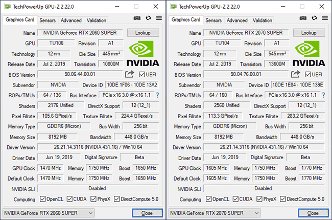 GPU-Z GeFORCE RTX 2060 SUPER et 2070 SUPER