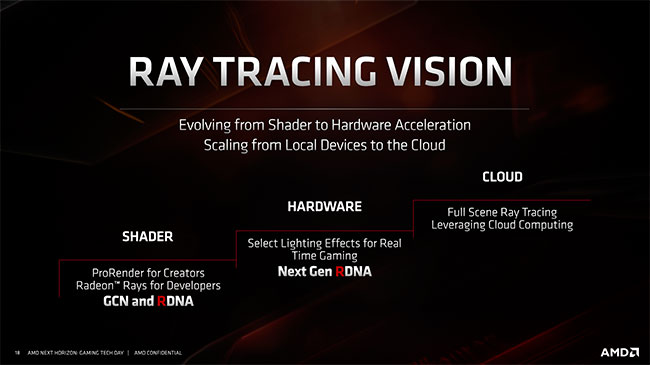 Difficile depuis le lancement de Turing de complètement oblitérer la question du Ray Tracing. AMD en est bien conscient et a donc préparé sa réponse à ce sujet. Pour le moment, c'est un peu "circulez il n'y a rien à voir" (ce qui n'est pas faux non plus en termes de contenu pour l'heure), l'accélération hardware de ce type de rendu 3D n'avait pas été prise en compte lors de la conception de RDNA. Les rouges s'en tiennent donc pour l'heure à leur approche destinée aux applications professionnelles. Par contre, comme les annonces côté consoles et la dépose d'un brevet sur le sujet l'ont laissé entendre, une prochaine itération de RDNA proposera bel et bien une accélération matérielle de cette technique de rendu hybride, lancée par son concurrent. Enfin, AMD partage également sa vision plus lointaine sur le sujet, avec un usage du Cloud Computing pour un rendu intégralement en Ray Tracing à l'avenir.