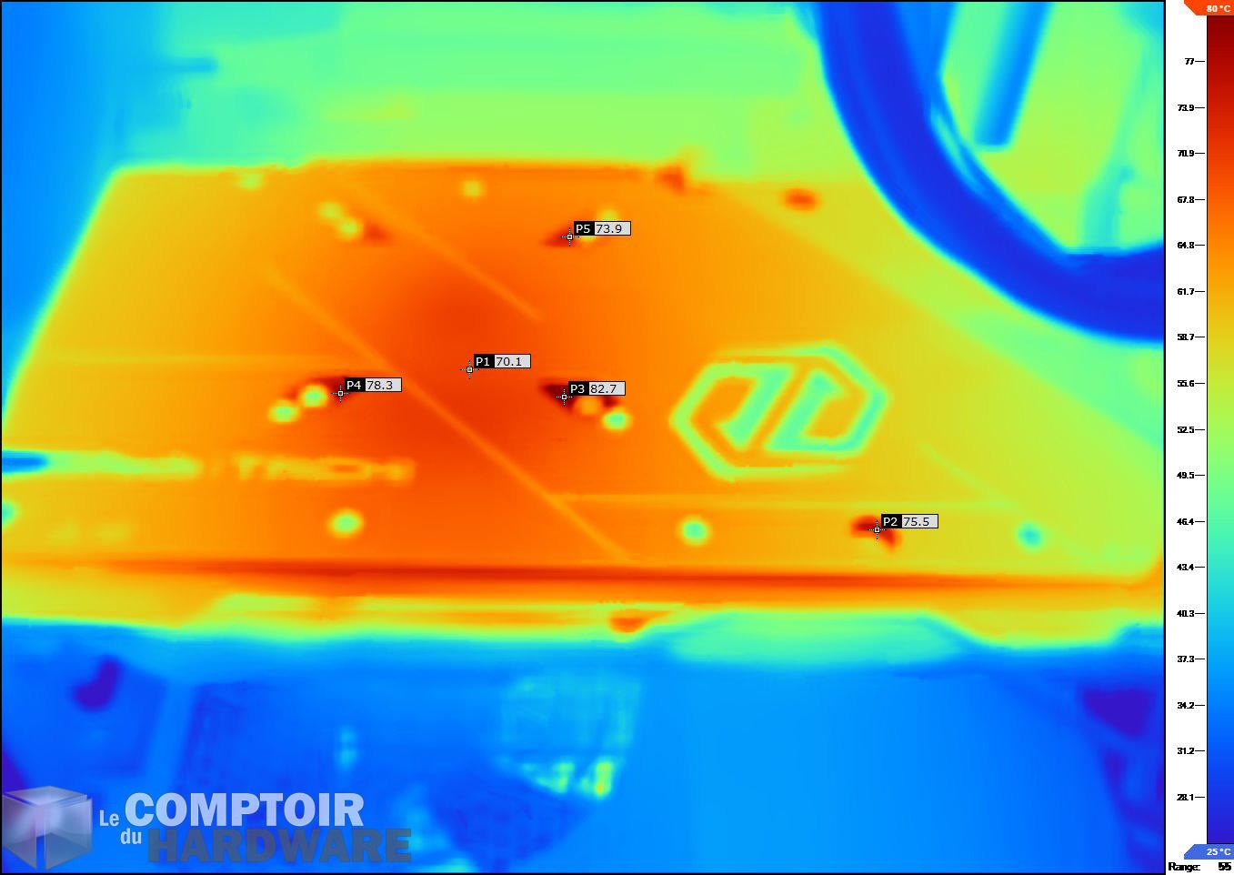 Cependant la carte profite d'une plus grande souplesse chez AMD que chez son concurrent par l'utilisation de la température "Hot Spot" comme limite plutôt que la globale mesurée sur le GPU, tout en restant correct au final avec une valeur maximale de 87 °C. Mais il faut prendre en considération un point, cette température s'obtient avec le blocage dès 88 °C à 60 % de la ventilation, ce qui veut dire que pour quelques décibels de plus, il est possible d'avoir une puce Navi 10 - et une mémoire - plus fraîche, ce sera selon les goûts des utilisateurs. La backplate aide légèrement à réduire les surchauffes aussi, mais elle manque encore d'interface thermique avec le PCB ou d'une bonne conception double face pour être efficace.