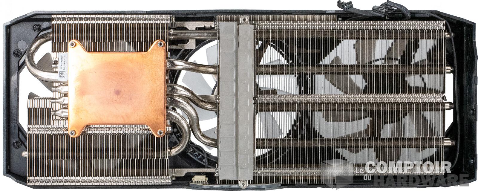 Le système proposé par ASRock est quelque peu étonnant, car si la carte se permet un overclock assez fort celle-ci manque d'un radiateur épais et solide comparé à la puissance déployée, il faudra donc se reposer sur la ventilation et son efficacité. De même, si le refroidissement des VRM est directement mis sur le radiateur, les puces mémoire ne sont pas liées quant à elles, une erreur déjà vues et qui parfois se solde par une surchauffe excessive de la GDDR6, bloquant l'exploitation correct du GPU. C'est toujours navrant de voir que plusieurs constructeurs se sont reposés sur de simples plaques aluminium au lieu d'avoir un contact franc avec un radiateur plus efficace.